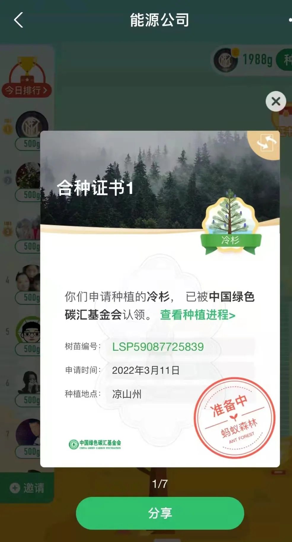 “一花一草皆生命,一枝一葉總關(guān)情。”早在2019年起,公司就通過(guò)支付寶螞蟻森林組建了一只“能源公司云種樹小隊(duì)”,如今隊(duì)伍人數(shù)越來(lái)越壯大,已有59位隊(duì)員,截止目前,在酒泉、大理、邯鄲等地,種下了冷杉、側(cè)柏、云杉、胡楊等7棵大樹。3月11日,在小伙伴的共同努力下,我們又種下了一棵冷杉樹,該樹被中國(guó)綠色碳匯基金會(huì)認(rèn)領(lǐng),將種植到?jīng)錾街莸貐^(qū)。